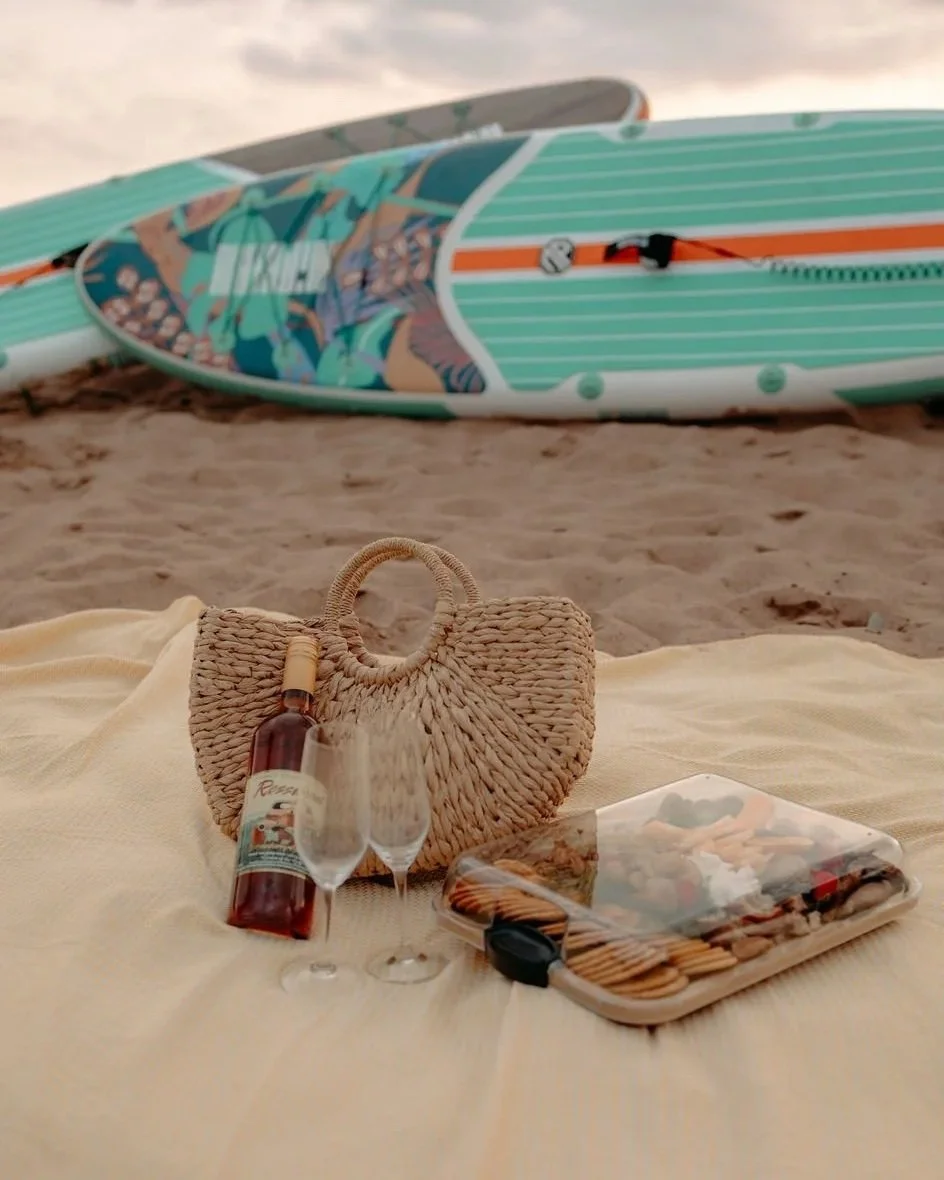 Paddle out to your pre-set picnic on the beach, our set up includes umbrella, beach blanket, chairs, low table, Bluetooth speaker, and of course your special picnic which includes sparkling beverages, water, and “Sea”-cuterie by Cape Reef Seafood & Smokehouse.